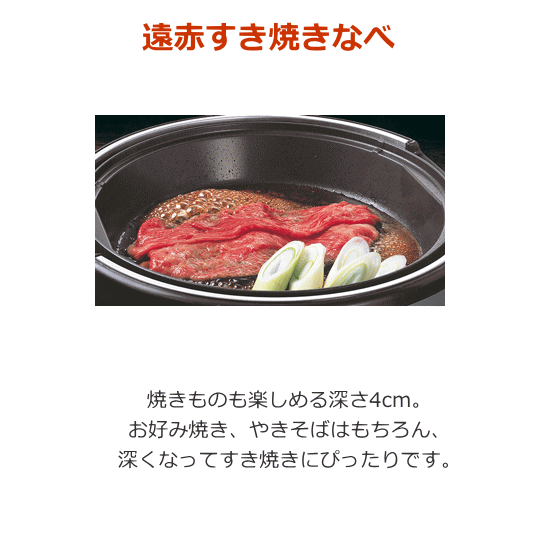 ・・・・・・・・商品特長・・・・・・・・ 家族みんなが大満足 1台3役! 「土鍋風なべ」 「遠赤すき焼きなべ」 「平面スペース/溝つき遠赤焼肉プレート」 がついて1年中大活躍!! ◎ポイント ・1台3役 ・丸洗いOK ・ハイパワー最高温度230℃ ◎水量目盛つき土鍋風なべ 濃縮タイプの鍋つゆや雑炊などに便利な 水量目盛つき。